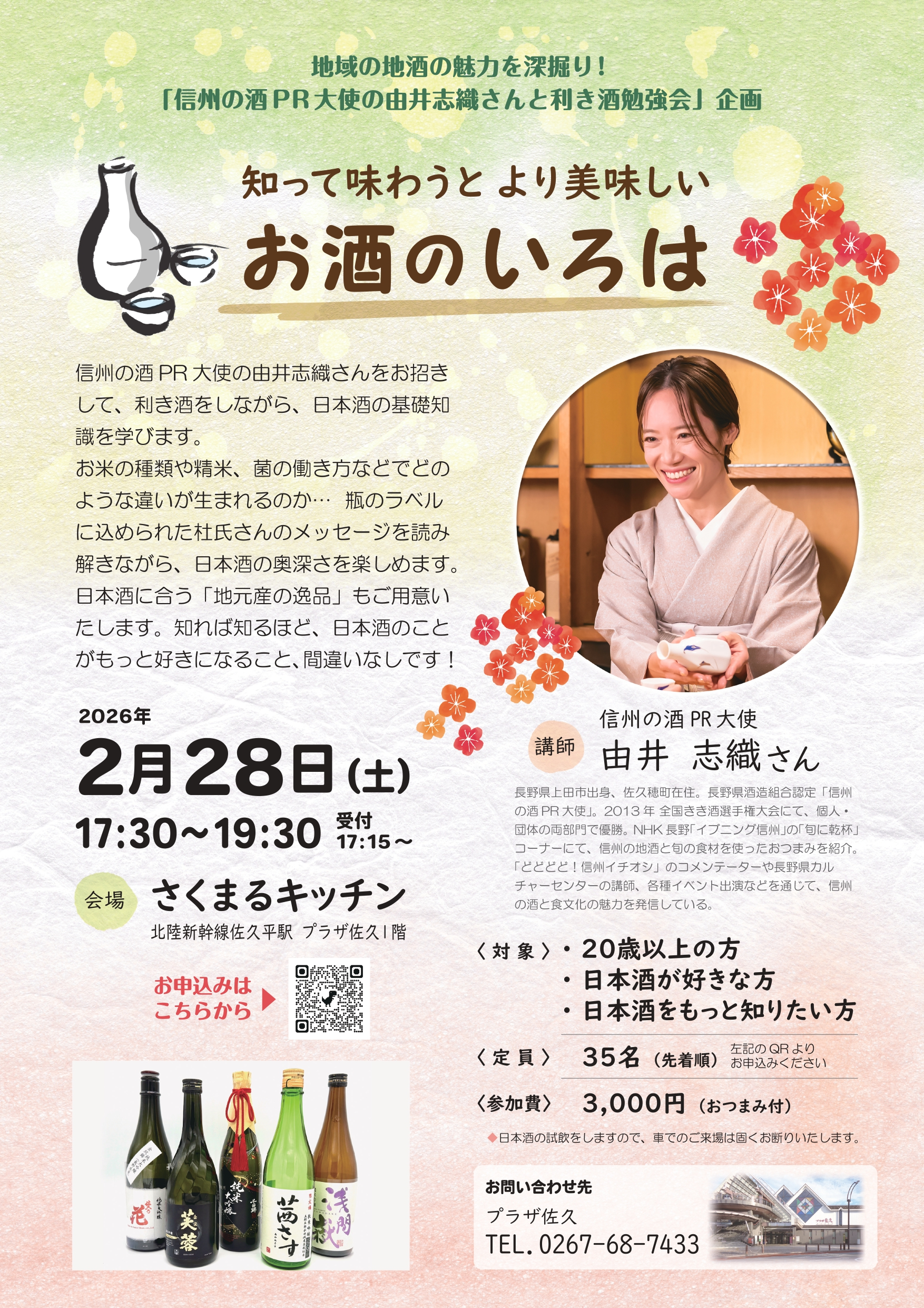 # 🍶 「お酒のいろは」利き酒勉強会イベント情報 🍶 ### 📅 日時・場所 - 2026年2月28日(土)17:30〜19:30(受付 17:15〜) - 会場:さくまるキッチン(プラザ佐久1階、北陸新幹線佐久平駅) ### 👩‍🏫 講師ゲスト - 由井 志織さん(信州の酒PR大使) ...もっと読む