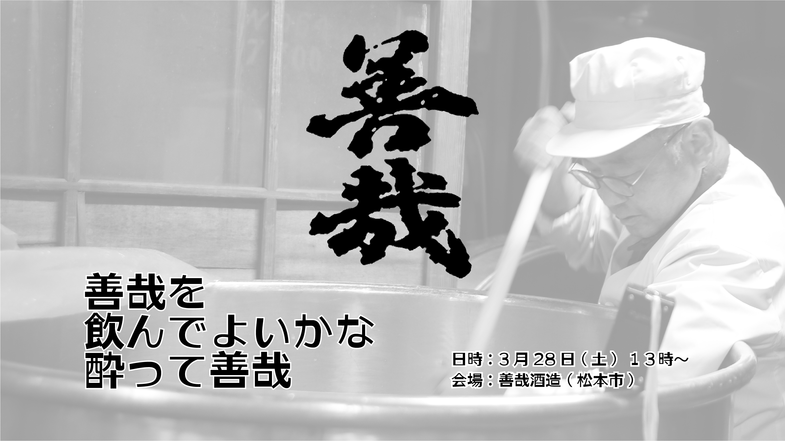 松本ワンカッ部 ☆善哉を飲んでよいかな 酔って善哉☆ 今回は松本市で市街唯一の酒造・善哉酒造さんのご協力の元、 杜氏さんや蔵人さんと今期の新酒を楽しむ会。 リブランディグ中で進化し続けている善哉を是非お楽しみください✨ ※※※初めにお読みください※※※ 会場が酒造となりますので、 衛生上の関...もっと読む