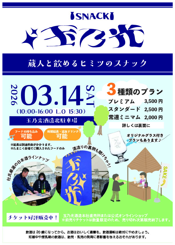 https://ec.tamanohikari.co.jp/products/snacktamanohikari 🍶🌸 スナック玉乃光2026 🌸🍶 お待たせしました! スナック玉乃光、パワーアップして帰ってきた! たくさんのお声にお応えして 👉 イスあり・プレミアムプラン登場! 蔵開き会場に、 ...もっと読む