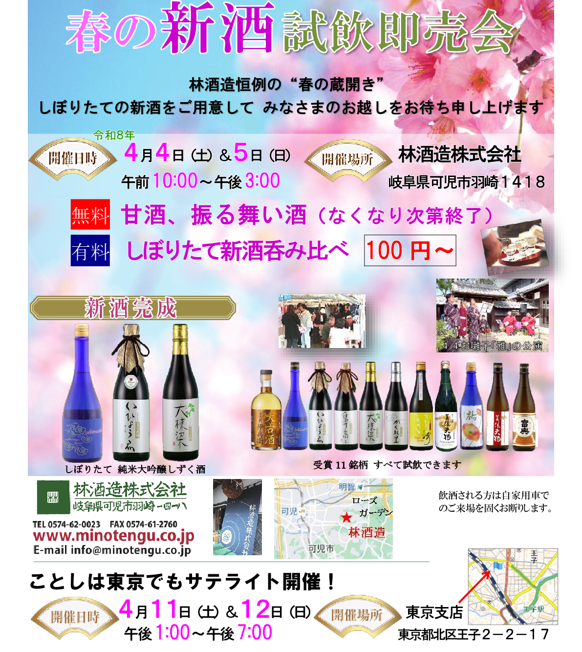 https://www.instagram.com/p/DVnKXI0gR8M/ 美濃天狗醸造元・林酒造の蔵開きを弊社の東京支店でも開催します。 日時: 4/11(土)~4/12(日) 13:00~19:00 場所: 東京都北区王子2-2-17 林酒造 東京支店 内容: ・全国新酒鑑評会に出...もっと読む