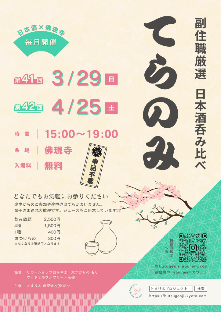 * **URL:** https://butsugenji-kyoto.com/project 【 第41回 てらのみ 】を今週末、開催いたします! 日時は 3月29日(日)15:00〜19:00 です。 ※今回は日曜日開催となっております! いつも「てらのみ」を支えてくださり、本当にありがとうご...もっと読む