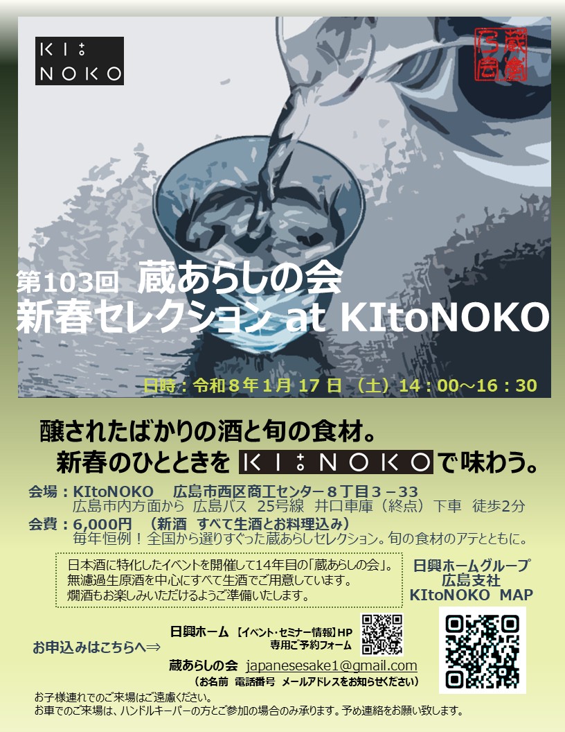 会場: 松戸観光案内所2階 (松戸市本町7-3 松戸駅西口徒歩3分) 会費: 入場料 おひとり様/当日500円(和ぎ水付き)※前売券あり(お買物割引特典付き) #香取 #鍋店 #地酒 #千葉 #造り #光 #津 #関 #原 #上 #御宿 #酒々井 #富津 #松戸 #蔵元 #酒類 #一品 #水 #地 #飯沼本家 ...もっと読む