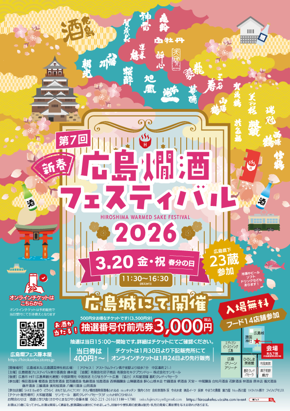 会場: 広島市中央公園内 広島城 本丸 下段(広島護国神社前広場)広島市中区基町21-1 https://hirosakefes.wixsite.com/event みなさま、お待たせいたしました❣ 春の広島城にて 『第7回 新春!広島燗酒フェスティバル 2026』 今年も、春分の日に開催いたします‼ ※...もっと読む