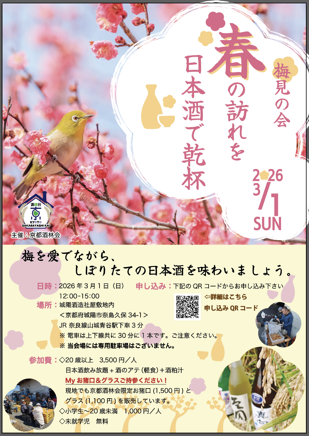 会場: 城陽酒造 https://kyoto-sakabayashi.com/?p=568 隣に梅林が広がる城陽酒造社屋敷地内で、梅を愛でながら春の訪れに日本酒で乾杯しましょう♪ 日本酒は、京都酒林会限定の3銘柄と京都酒林会所属3蔵の日本酒3銘柄の計6銘柄が飲み放題です。 京都酒林会所属の酒屋によるお酒のアテ...もっと読む