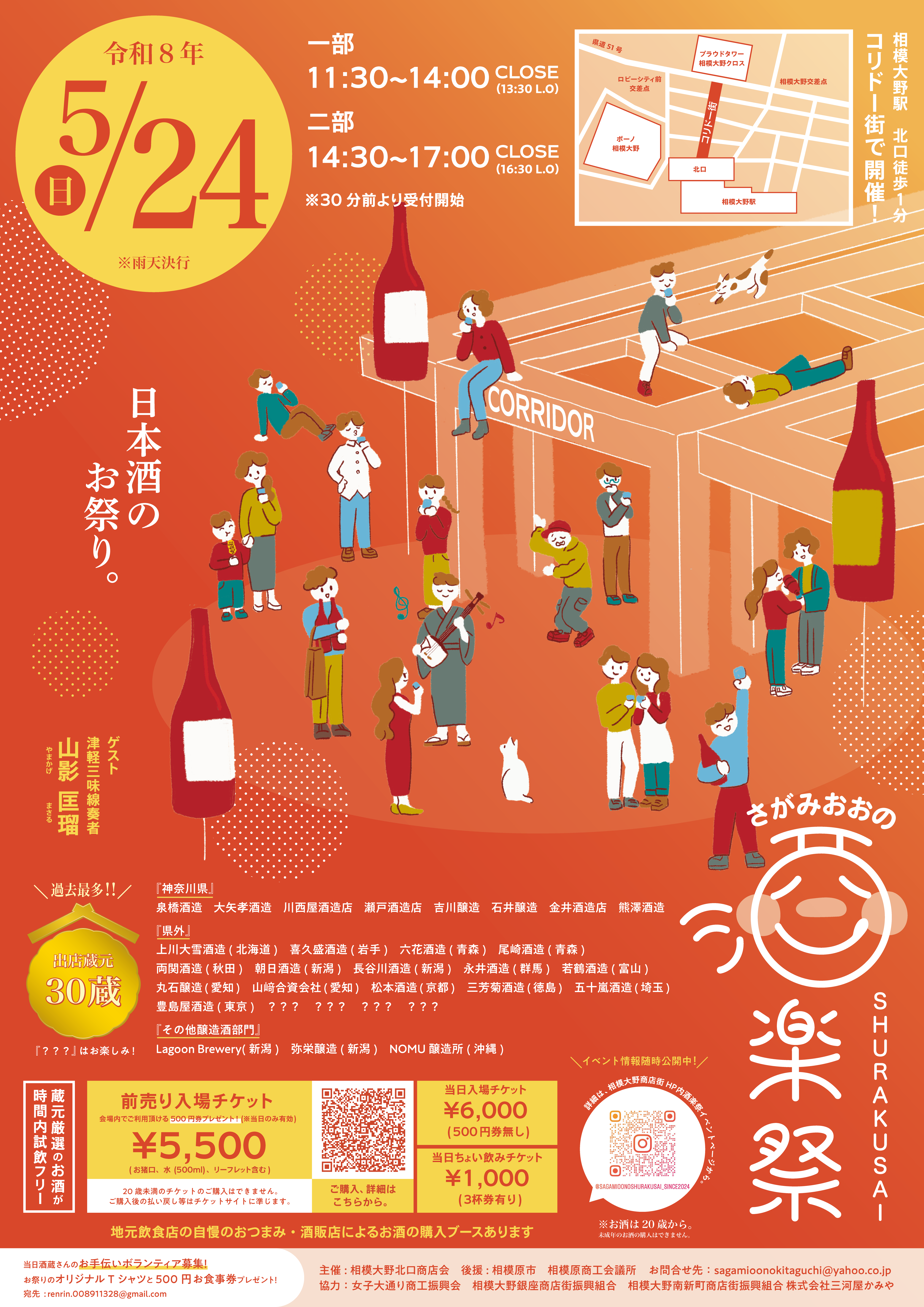 * **URL:** https://www.instagram.com/sagamioonoshurakusai_since2024?igsh=ZmQ4YmIweXlleDUw 30蔵の日本酒の蔵元を相模大野にお招きして、骨の髄まで日本酒を楽しもうという企画です。 前売りチケットをご購入で90種類以上の日本酒が...もっと読む