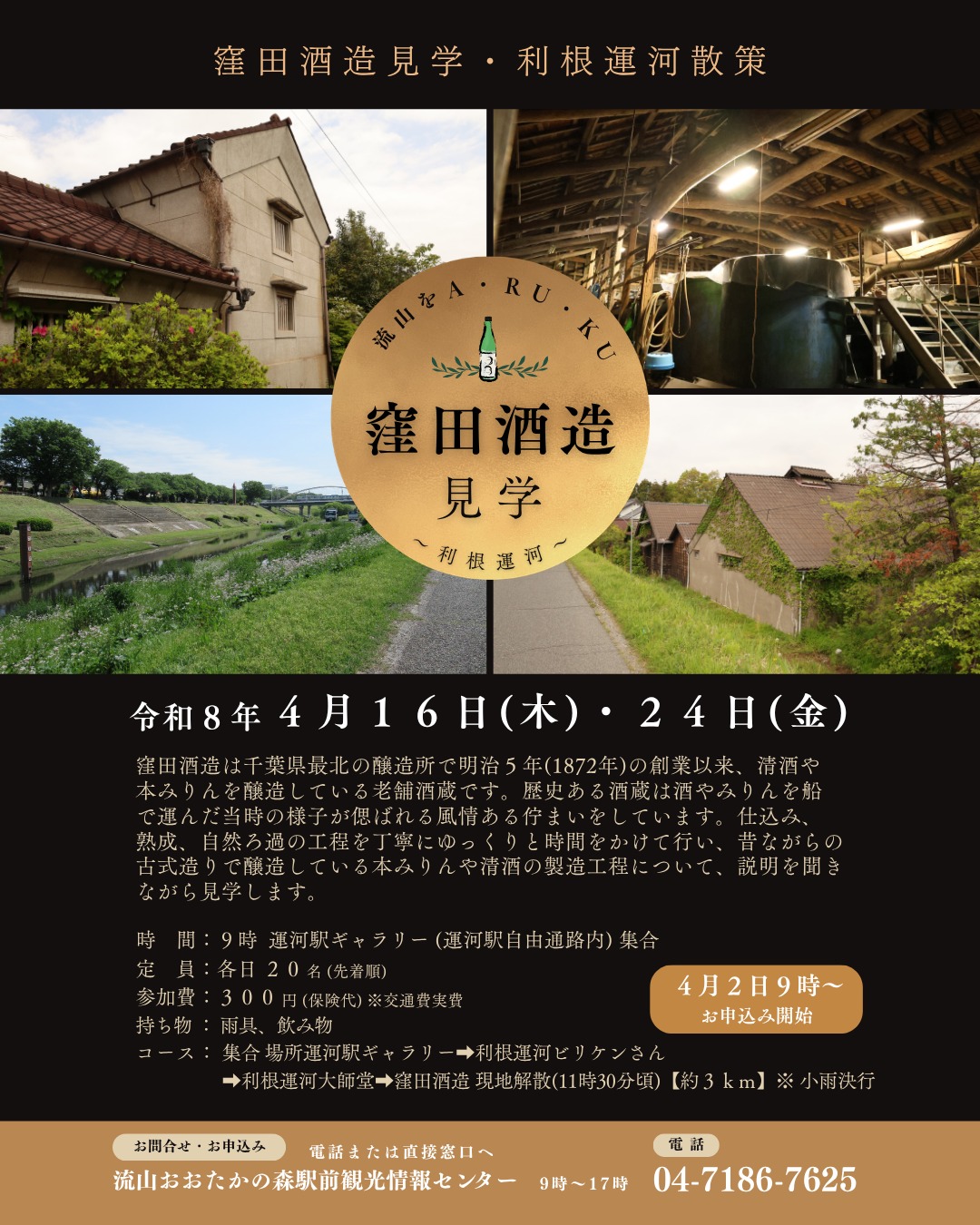* **URL:** https://www.instagram.com/p/DWFrJ0jj4T0/ # 🍶窪田酒造見学・利根運河散策イベント🚶‍♂️🌿 - **開催日**:令和8年4月16日(木)・24日(金) - **集合時間・場所**:9時に運河駅ギャラリー(運河駅自由通路内)集合 - **定員...もっと読む