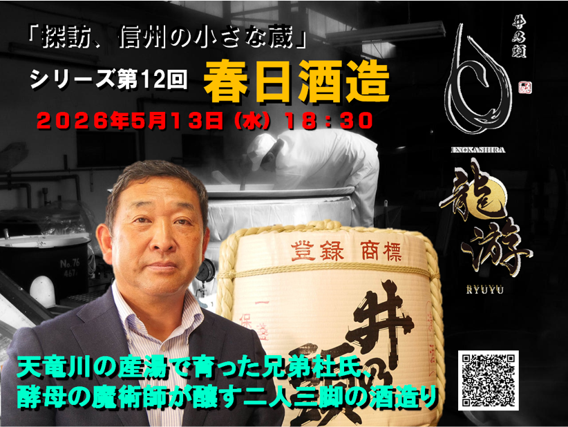 * **URL:** https://www.tablecheck.com/gashue/reserve/experience/69df19ba9586268d2e3af8b3 中央アルプスと南アルプスに囲まれた信州伊那谷の地、天竜川の流れる長野県伊那市で銘酒「井乃頭」「龍遊」を醸す春日酒造は、東京農大醸造学科卒...もっと読む
