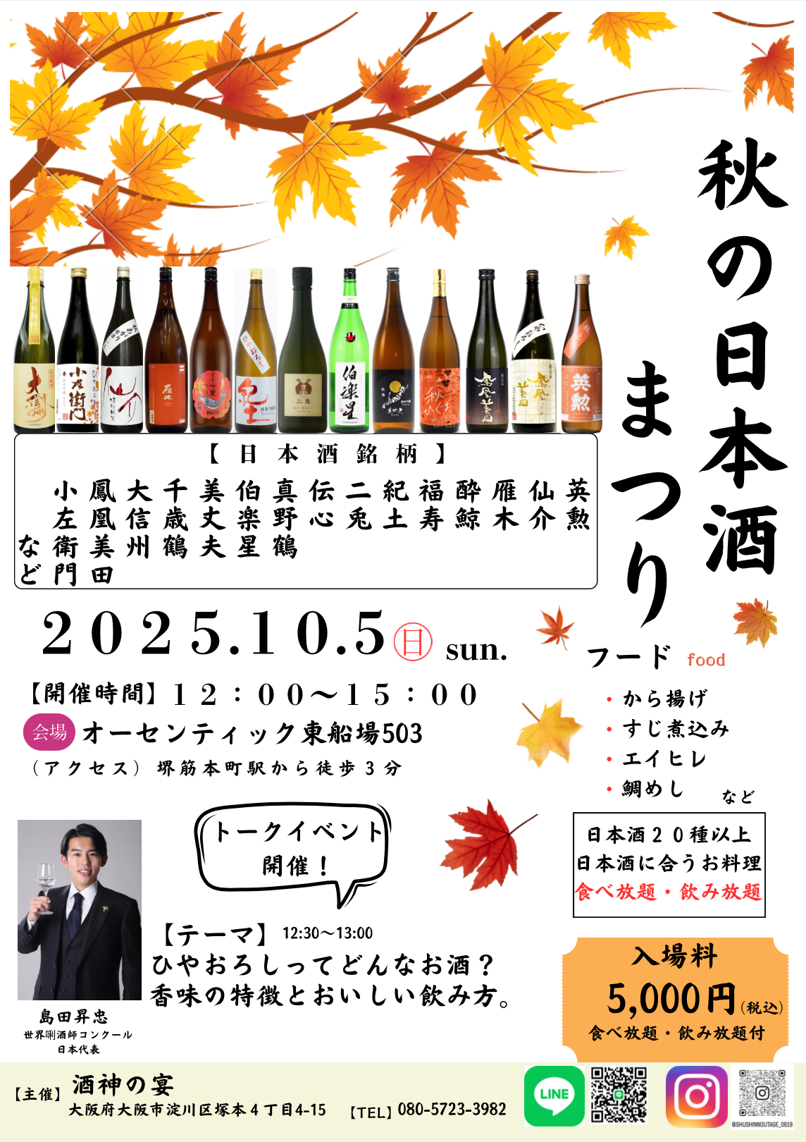 会場: オーセンティック東船場 https://passmarket.yahoo.co.jp/event/show/detail/02zm36f642q41.html 秋の日本酒祭り開催! 大阪堺筋本町にて【秋の日本酒祭り】を開催。 ひやおろし、秋上がりを思う存分楽しむ日本酒イベントです。 イベン...もっと読む