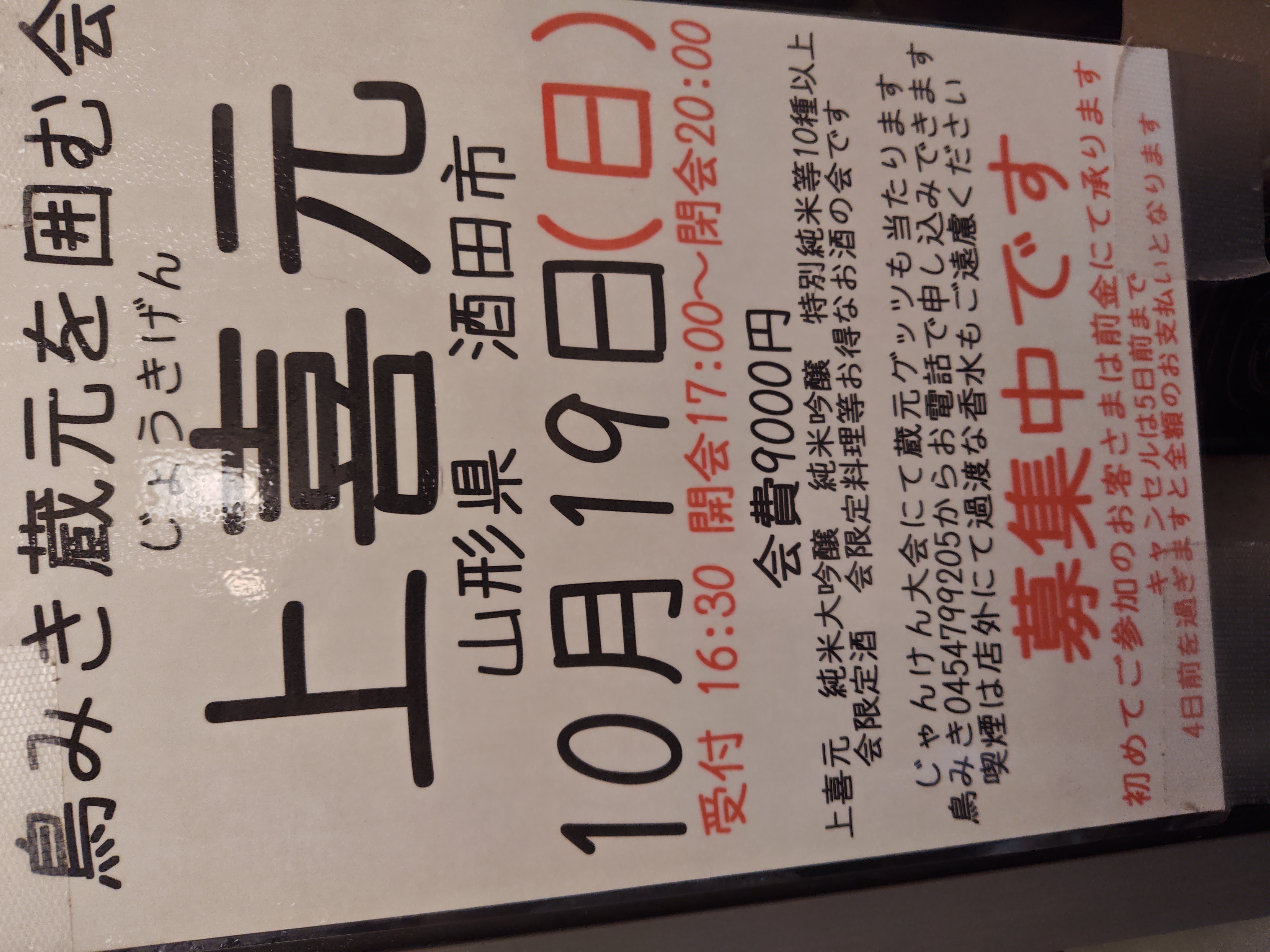 https://torimiki.owst.jp 鳥みき初の開催 上喜元さま 杜氏の内藤さまに製造課長の海藤さまの2人でご来店されます。 清酒業界のお米マイスターの上喜元 鳥みき限定のお料理に合わせて 上喜元を飲みましょう! #杜氏 #清酒 #横浜 #上喜元 #南 #蔵 #鳥みき #米 #蔵元 #上 ...もっと読む
