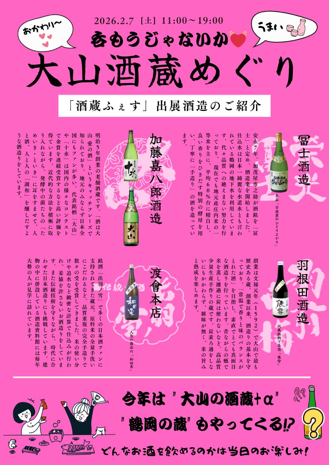 https://yamagata-tsuruoka-ooyama.peatix.com/view # 🍶 **大山酒蔵ふぇす in 東京** 🗼 - **開催日**: 2026年2月7日(土) - **場所**: 東京・西新橋 - **参加酒蔵**: 山形県鶴岡市・大山地区の酒蔵 ## 🌟 **イベン...もっと読む