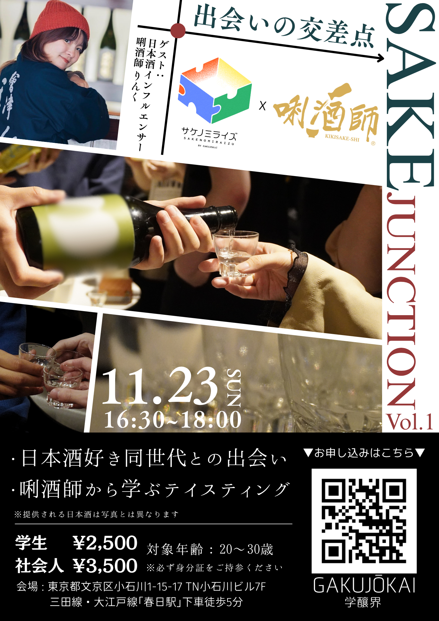 https://sake-junction.peatix.com 〈「好き」からもう一歩、「出会い」と「学び」へ〉 同年代の日本酒仲間と出会い、 日本酒への想いを「好き」から「学びたい」へと昇華させませんか? 記念すべき第1回目のSAKE Junctionでは、20代の唎酒師・りんくさんにお越しい...もっと読む
