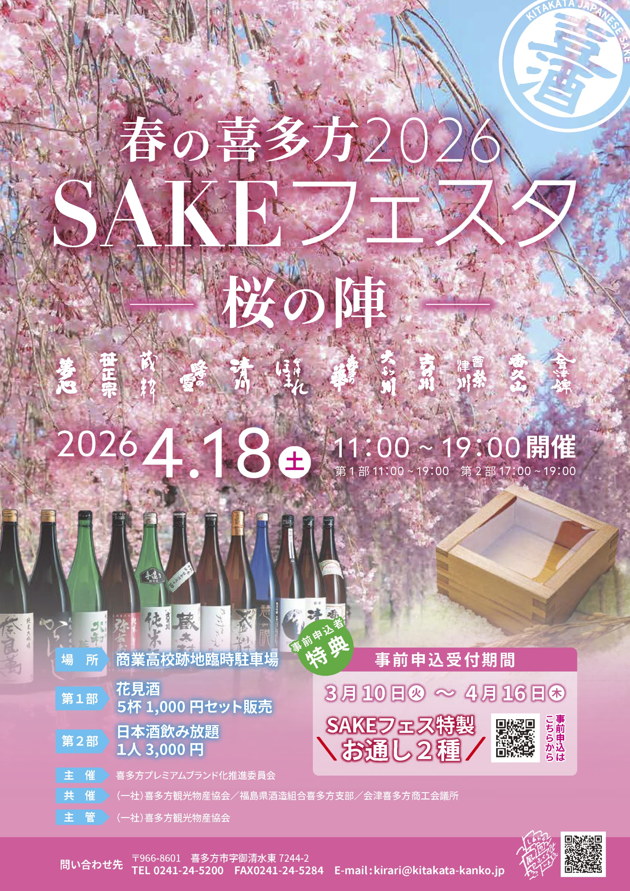 * **URL:** https://www.fukushima-dc-cp.jp/event/6010/ 🌸桜花爛漫🌸1日だけの限定イベント! 【KITAKATA SAKE フェスタ 2026 桜の陣🌸】 \当日は、喜多方選りすぐりの銘酒が集結します🍶🌟/ ……………………………………………………...もっと読む