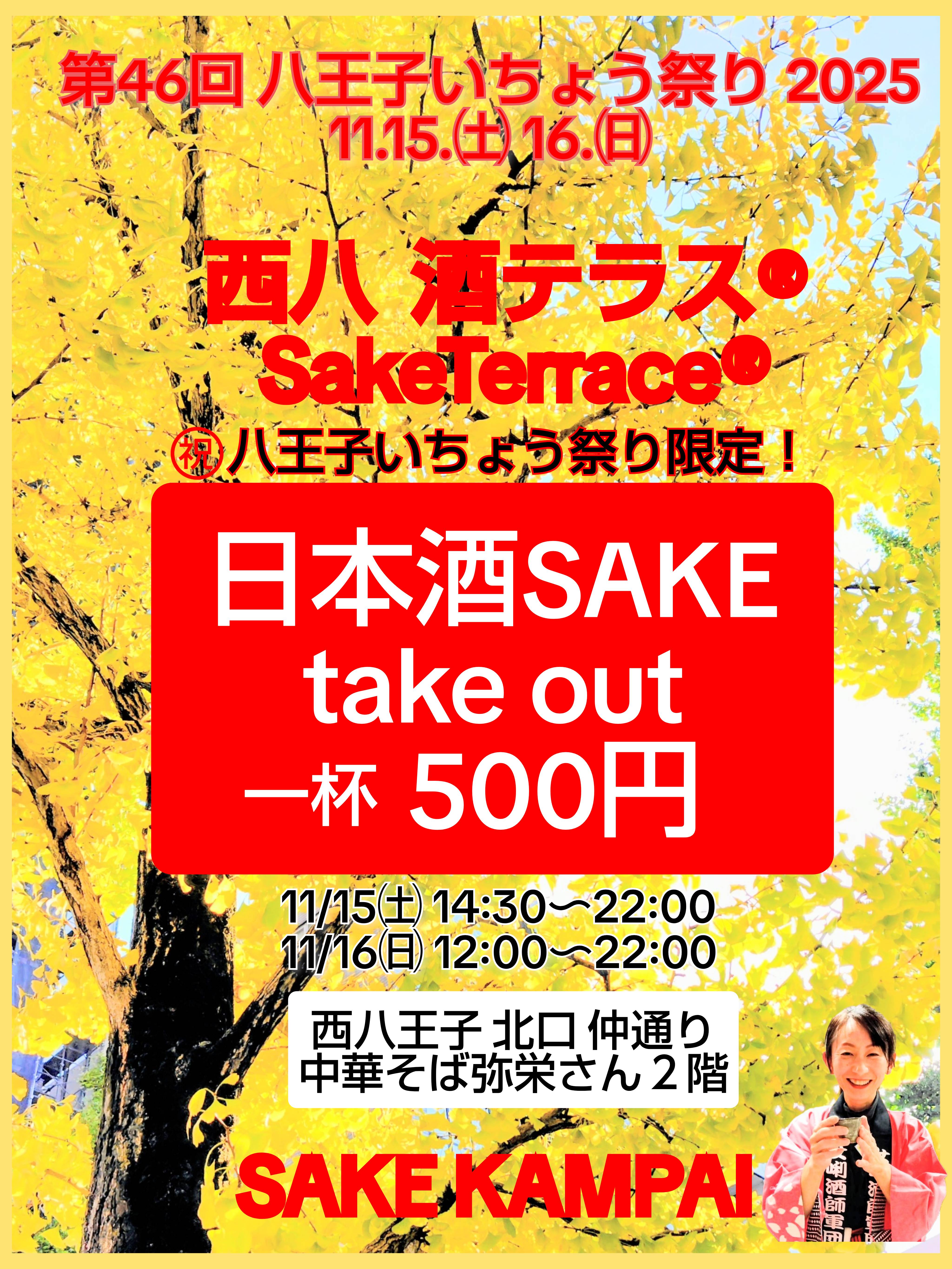 第46回 八王子いちょう祭り開催を記念して、11/15㈯16㈰2日間限定で【西八 酒テラス®SakeTerrace®】にて【日本酒 SAKE take out一杯500円!】御提供いたします