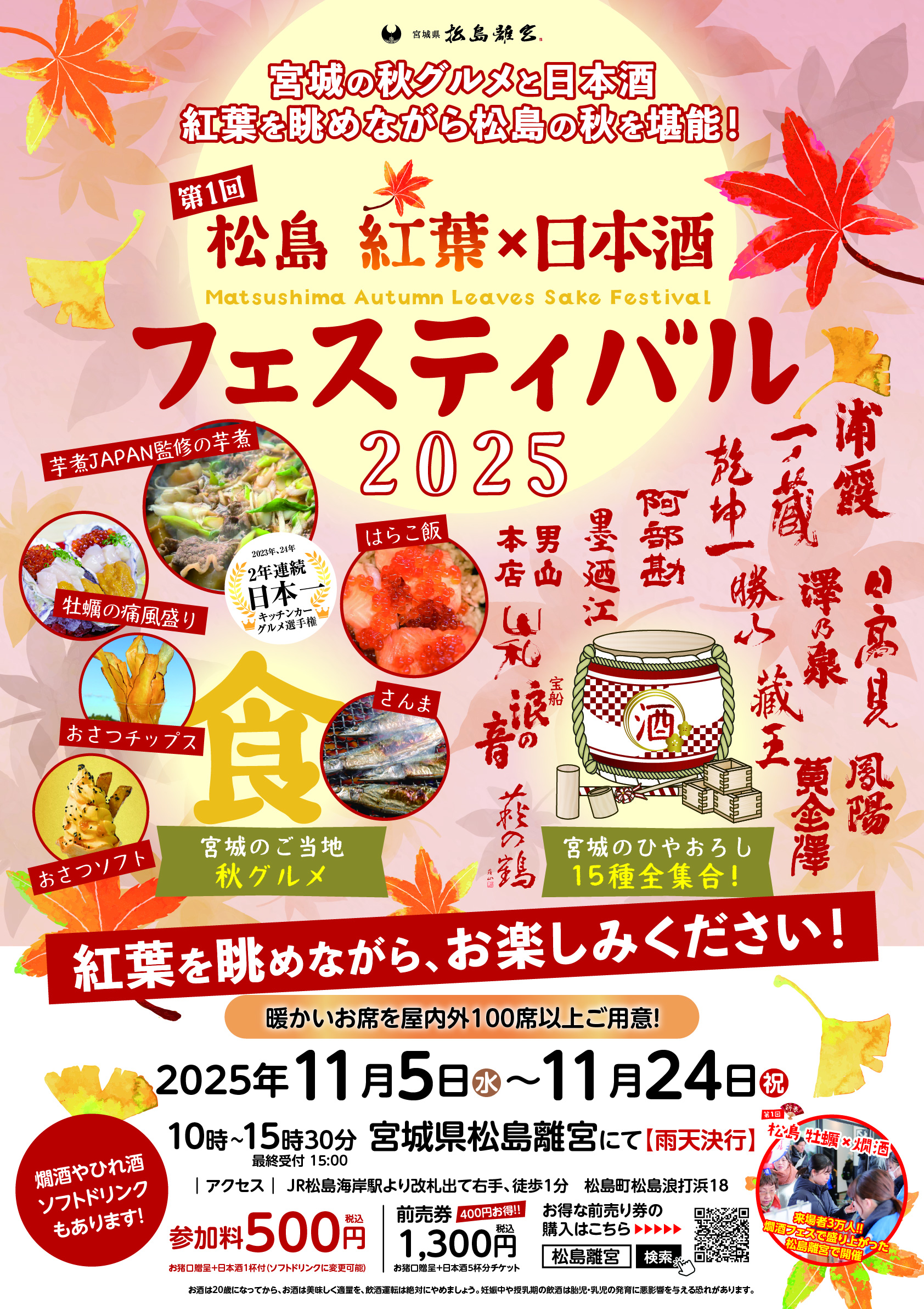 本イベントでは、2025年2月に開催し、来場者3万人と大好評を博した『松島 牡蠣×燗酒フェスティバル』の熱気を受け継ぎ、規模をさらに拡大。皆様からのご期待に応えるべく、宮城の秋グルメと日本酒を色鮮やかな紅葉のもと、心ゆくまでお楽しみいただけます。