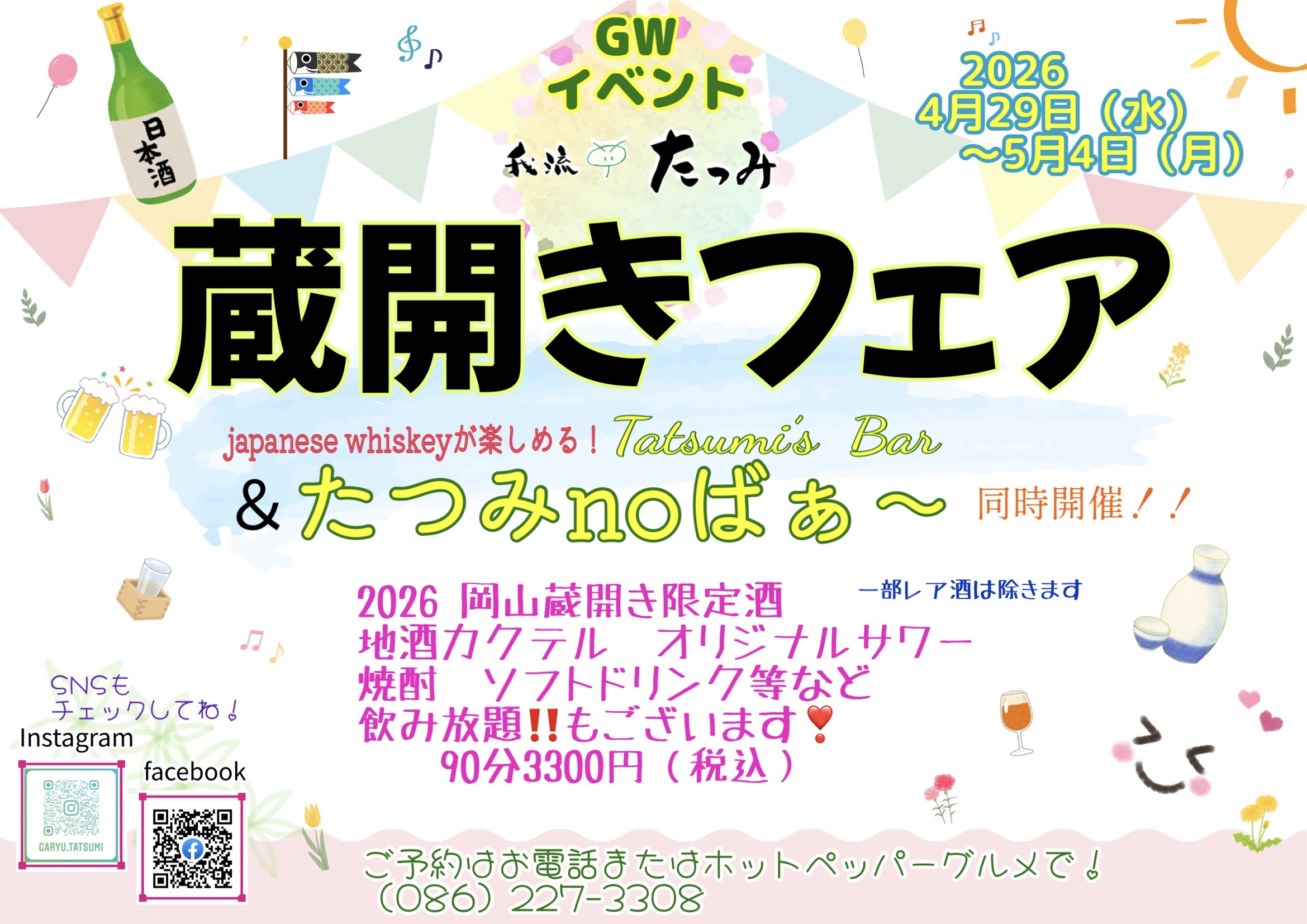 2026年岡山県下の酒蔵さんの蔵開き限定酒や数量限定のレアなお酒が飲み放題!高級ウィスキーも飲める『たつみのばぁ〜』も同時開催! 旬の魚、活けあなご等美味しい肴を一緒にお楽しみください! 詳しくはインスタ、Facebookをご覧ください。