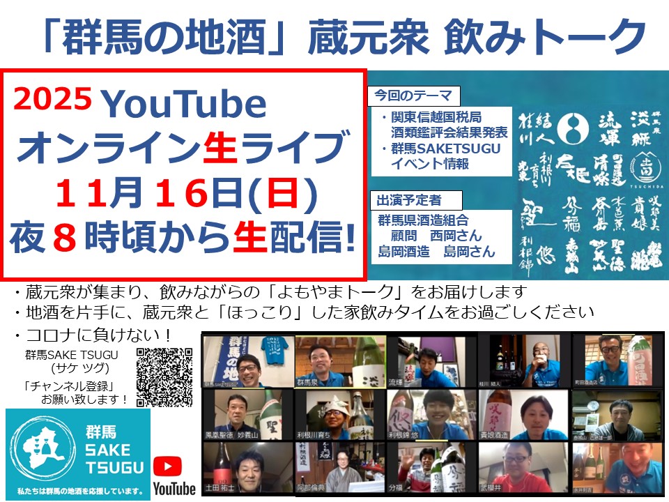 https://www.gunma-saketsugu.jp/ https://www.youtube.com/watch?v=j98R1tpSH2w 「群馬の地酒」を応援している群馬SAKETSUGUが、「群馬の地酒」蔵元や杜氏らをゲストに招き、飲みながらの生トークライブを配信。 楽しい家飲み時間を過ごしていただ...もっと読む