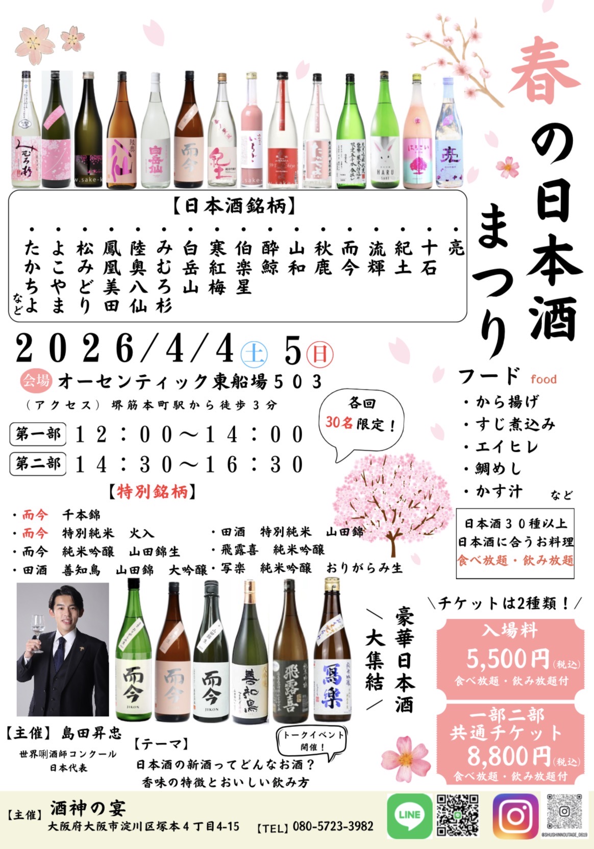 https://passmarket.yahoo.co.jp/event/show/detail/026bjhi78jz41.html 春の日本酒まつり2026開催決定! 毎回満員御礼! 大人気日本酒イベントが2026年もやってくる! 世界唎酒師コンクール日本代表の島田昇忠が主催する日本酒イベント。 ...もっと読む