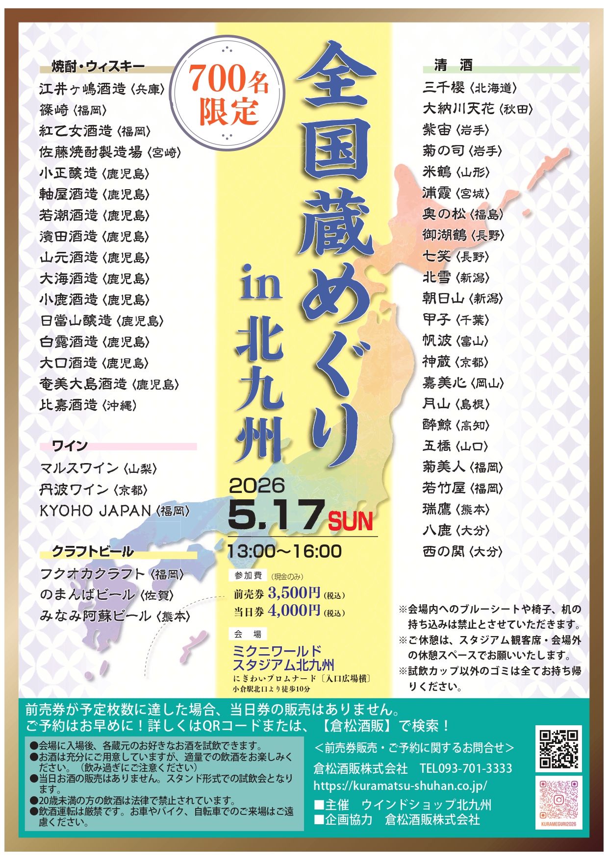 会場: ミクニワールドスタジアム北九州 前売り: ¥3,500 当日: ¥4,000 定員: 700※無くなり次第終了 連絡先: 倉松酒販株式会社 TEL:093-701-3333 住所:福岡県北九州市若松区南二島2丁目2-47 営業時間:8:30〜17:30(土日祝日を除く) https://kuramatsu-sh...もっと読む