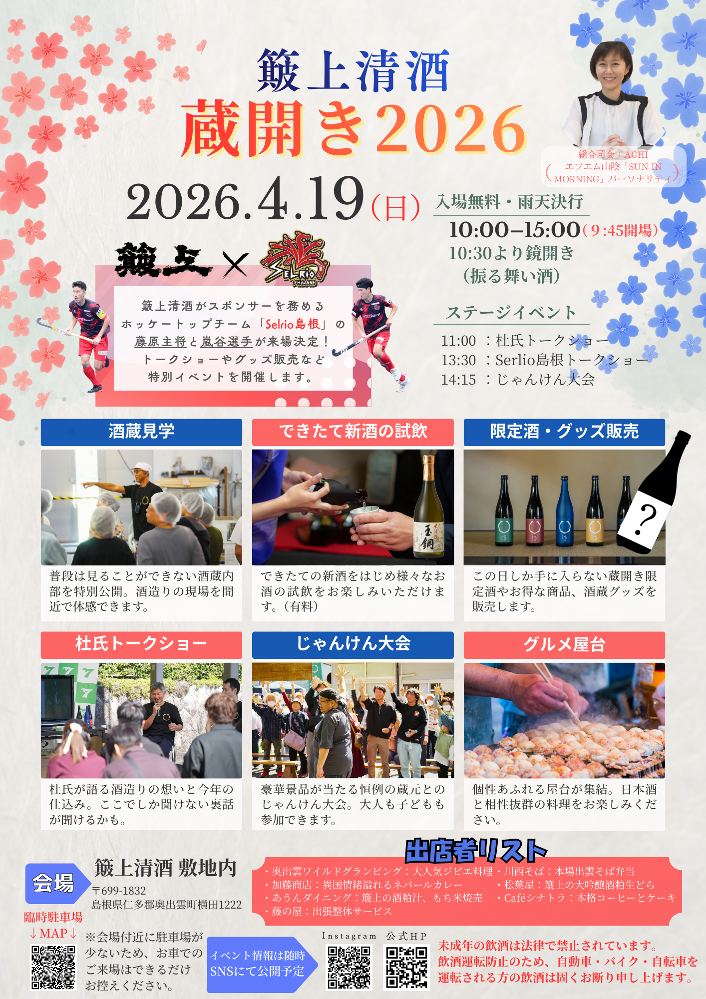 https://sake-hikami.co.jp/topics/1616/ # 🍶 鍛上清酒 蔵開き2026 🎉 - 📅 **日時**:2026年4月19日(日)10:00~15:00(9:45開場) - ☔ 雨天決行・入場無料 - 📍 **場所**:鍛上清酒敷地内(島根県仁多郡奥出雲町) ...もっと読む